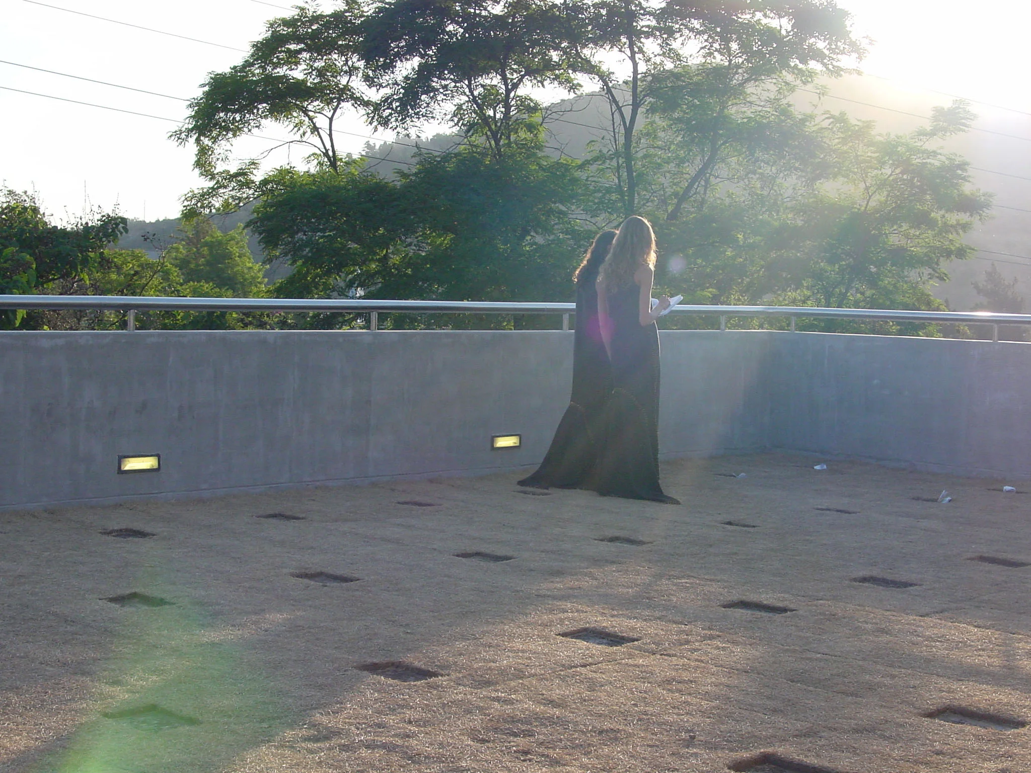 Los lugares localizan espacios[1], por lo que podemos afirmar que al producir un lugar-galería se localiza un espacio del y para el arte. Comprendemos entonces que la galería Animal, como lugar, localiza el espacio del arte, lo cual define su propia identidad. Nuestra instalación EN MEMORIA apropiándose del lugar reflexiona sobre el lugar-galería, su historia, sus referencias y sus características formales. La obra, ubicada en la azotea de la Galería Animal se apropia de su límite superior, el cual como umbral, marca un adentro de un afuera, delimitando el lugar-galería del Espacio como extensión. Para nosotras apropiarse del límite, azotea de la galería Animal, es tomar posesión desde donde el lugar comienza su esencia y no aquello en donde acaba, es reflexionar sobre el lugar desde su frontera. Desde el interior la azotea no forma parte de la galería, pero la delimita, es por esto que, como límitepresente pertenece, al mismo tiempo, al espacio interno y al espacio externo. El límite no es una barrera impenetrable, sino una mediación que articula las relaciones entre interno y externo, entre apertura y cierre, por tanto presionar el límite posee el valor de una tensión: la galería como recinto, tapizada en su límite superior por una fría alfombra de lápidas, se convierte en una tumba.