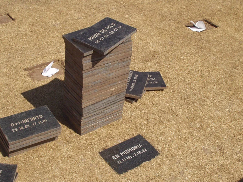 Si bien construimos lápidas para configurar un archivo, es la presencia de la lápida EN MEMORIA, sin fecha, la que da cuenta de la imposibilidad de su perdurabilidad. Así la instalación, en su desgaste material, asume el tiempo propio que identifica las instalaciones. Asume ese tiempo como su propia duración y lo revela en su devenir, la instalación se hace y se deshace en un lapso de tiempo, cuya extensión es el intervalo de instantes entre el montaje y el desmontaje. Subreve duración es una condición de su significado y es algo que se presupone en sus condiciones de existencia. La expectativa de no permanencia forma parte de su concepción.