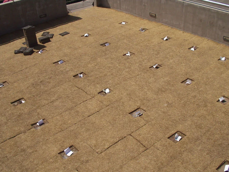 En la azotea de la galería Animal ubicamos cincuenta y un lápidas distribuidas en columnas ordenadas según una trama matemática, en la cual se demarcaba un territorio propio para cada lápida. Todas ellas, como un único cuerpo, asemejaban un cementerio sobre el cielo del recinto. Gran parte de la superficie de este cielo (azotea de la galería) lo cubrimos con pasto natural (9m. X 13m.) proveniente de las afueras de Santiago y trasladado hasta el suelo de la galería, subiéndolo posteriormente hasta la azotea con un máximo esfuerzo en un mínimo de tiempo. El peso total del pasto vivo que subimos a la azotea de la galería Animal alcanzó las tres toneladas. Posteriormente el pasto desprovisto de agua, se secó, con la tierra dura y agrietada, muere al poco tiempo, convirtiendo nuestra obra en un cementerio abandonado.