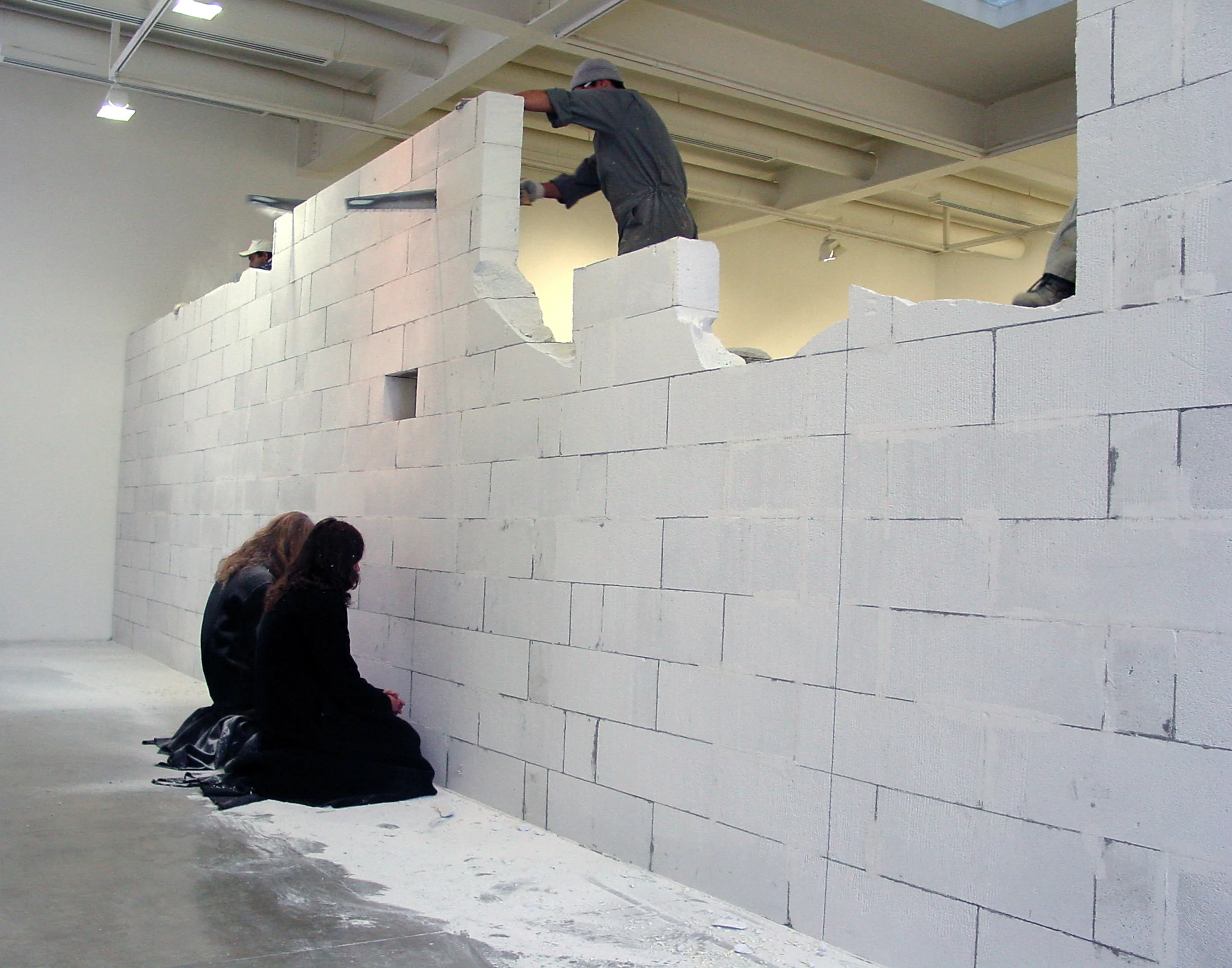Los muros son obras defensivas que rodean o protegen un territorio, manifestando el límite de conflictos de vecindad y de tantos otros recurrentes en la historia y el arte. Asimismo, son elementos que establecen nuevos espacios a partir de las clausuras que generan. Murar es cercar y guarnecer un recinto por tiempo indefinido, o al menos por el que justifique su escisión. Esta perdurabilidad objetiva fue puesta en cuestión por la duración limitada de OBITUARIO, del 12 de mayo al 5 de junio de 2004, condicionando su significado desde el momento que tenía prefijada su existencia. Su presencia entablaba una confrontación irreversible con la naturaleza del espacio de la galería, a partir de una contradicción ilusoria puesto que su erección no provenía de ninguna finalidad arquitectónica. Por el contrario, nuestra intervención dislocaba al espectador al enfrentar su percepción y su presencia corporal a los nuevos límites impuestos por nuestra obra. Durante tres semanas el muro inacabado esperó su propia muerte anunciada, su desaparición, su transitar en la memoria de un conflicto ficticio salvo el de su propia existencia.