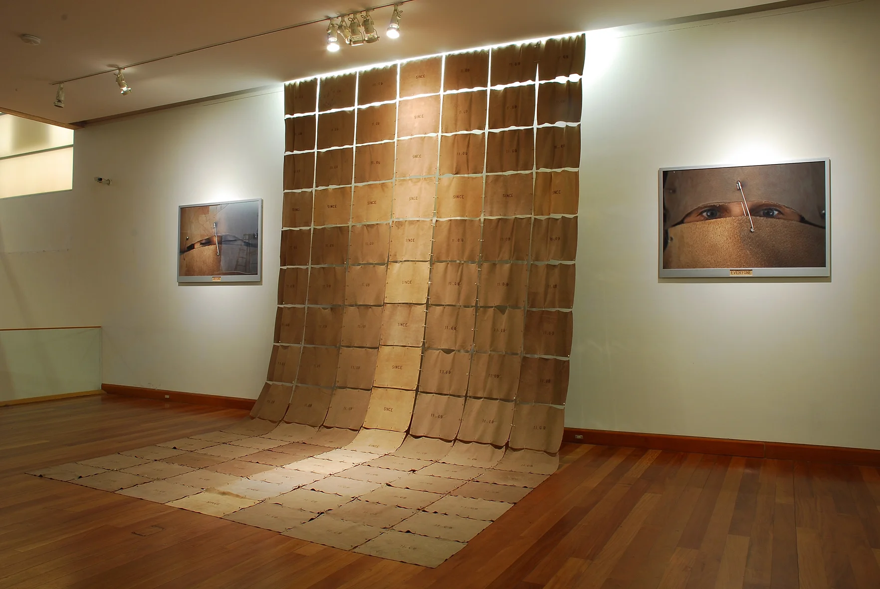 La izquierda y la derecha no se limitan a ser conceptos de orientación espacial, sino también, al interior del Cristianismo, de nuevo, constituyen alusiones al bien y al mal, como cuando Mateo cita a Jesús diciendo que quienes ubique a su derecha heredarán su reino, mientras los que deje la izquierda irán al fuego eterno. Por cierto, la izquierda y la derecha se refieren también a las orientaciones políticas, donde el bien y el mal cambian de lugar según el observador. Estas confrontaciones político-religiosas las reiteramos visualmente con nuestros rostros censurados, dejando asomar apenas los ojos a través de una rajadura unida con alfileres de gancho, que permite ver pero con dificultad. Con ello evocamos la burka, aquel tocado tradicional usado por las mujeres en los países musulmanes más conservadores. La burka no es un vestido, es un implemento que vela a la mujer de la mirada de los demás, al tiempo que le vela a ella la visión del exterior. En SINCE 11.09. esta connotación nos habla de la dificultad de poder ver con claridad lo que efectivamente sucede en el mundo, pues tanto para unos como para otros el campo visual de sus realidades son de estrecha interpretación.